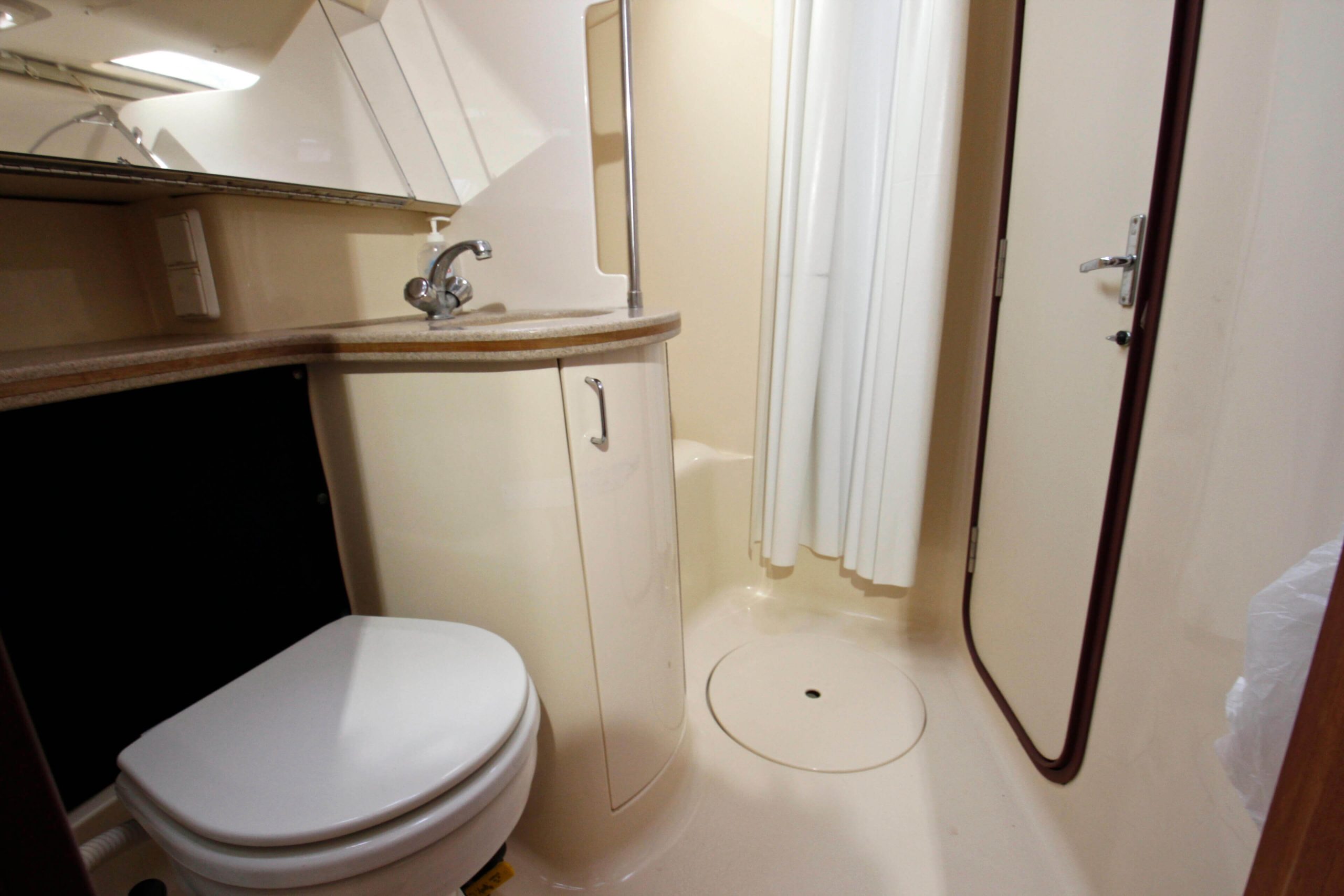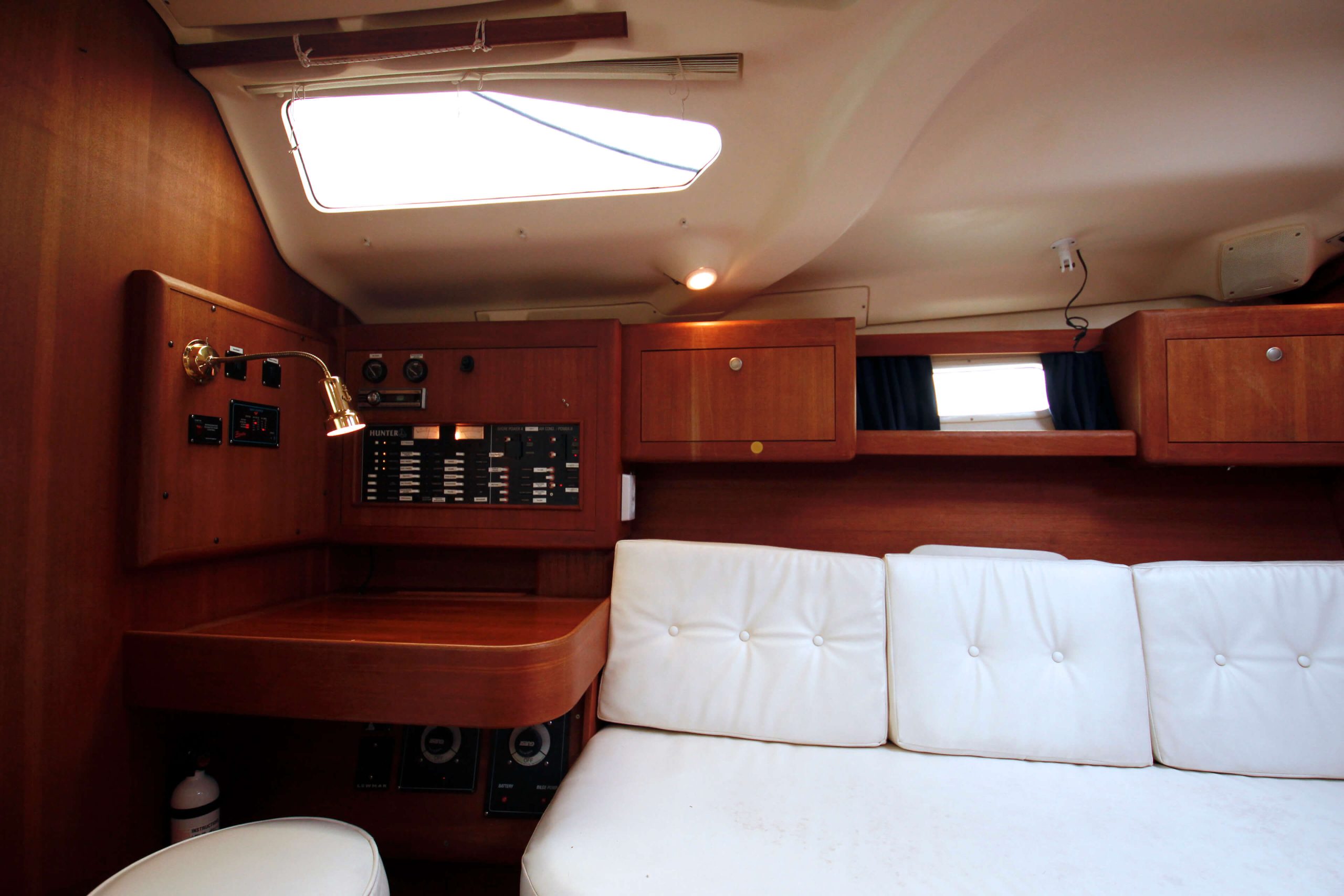 Belső: A Hunter 37 teakfa belsőt kapott és két különálló kabinnal rendelkezik, a hátsó achter kabinban található egy 80 cm-es plazma tv valamint külön bejárat a fürdőkabinba. Minden fekvő és ülő hely fehér bőrrel lett kárpitozva. Az első kabinban ruhásszekrény és kézmosási lehetőség található. A szalonban franciaágya alakítható szalonasztalt helyeztek el. Parti áramra csatlakozva a klíma berendezést hibátlanul lehet használni. Álló magasság 190 cm.